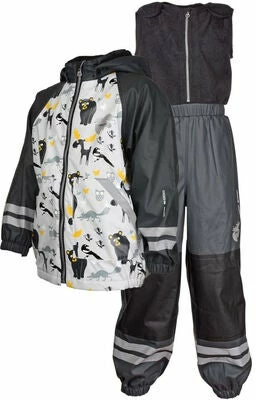 Regntøyet Lysekil fra Lindberg kommer til å holde barna tørre og varme i allslags ruskevær! Settet består av en fôret regnjakke med krage og avtagbar hette, samt fôret regnbukse med varmt fleeceliv og justerbar lukking på skuldrene. Buksene har forsterkninger på knærne, elastisk midje og justerbare fotstropper for bste komfort og passform. Både jakken og buksen i regnsettet Lindberg Lysekil har sveisede sømmer som holder vann og søle ute, og praktiske refleksdetaljer på ermer og ben.- Vannsøyle 8000mm.- Fleecefôr.- Sveisede sømmer. – Avtagbar hette.- Avtagbare og justerbare forstropper. – Forsterkede knær.- Refleksdetaljer.Materiale: 100% polyuretan. Fôr: 100% fleece.Farge: hvit, grå, svart.
