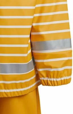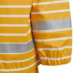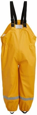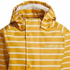 Koster regnsett fra Nordbjørn, for lek i allslags vær. Plagget er vanntett, har sveisede sømmer og en vannsøyle på 8000 mm (2000 mm etter fem vasker). De justerbare bukseselene holder buksene på plass. – 100 % PU.