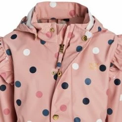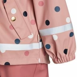 Claire regnsett fra Petite Chérie med ei prikkete jakke med rysjedetaljer ved skuldrene, trykknapper foran og en avtagbar hette. Det har en bukse med fotstropper og justerbare bukseseler og mange reflekser slik at barnet ditt er synlig i mørket. – Vannsøyle: 8000 mm. – Maskinvask 40°C. – 100 % PU.
