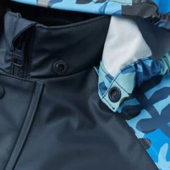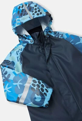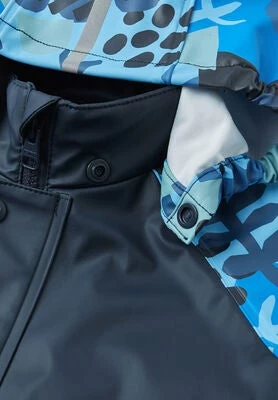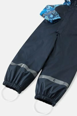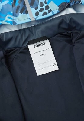 Vanntett Roiske fôret regndress fra Reima med en avtagbar hette. Den har fotstropper og refleksdetaljer , slik at barnet ditt er synlig i mørket. – Vannsøyle: 10000 mm. – 100 % polyester.