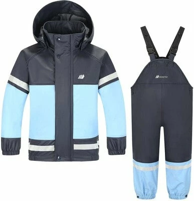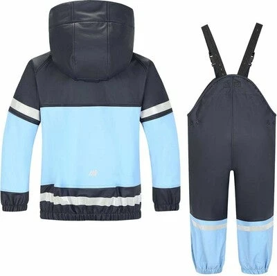 Vind- og vanntett Ona regnsett fra Skogstad med reflekser. Det har en avtagbar hette med et nettingfôr og avtakbare, justerbare fotstropper. Settet har forseglede sømmer og justerbare bukseseler. – Vannsøyle 8000 mm– 100 % PU